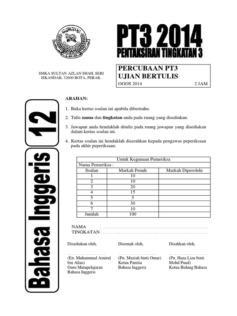 Bank Kertas Soalan Peperiksaan Percubaan PT3 2019 PT3 2018 PT3 2017 Skema Jawapan Semua Subjek. 3 Dont wear ___ socks over there. Semoga Perkongsian Soalan-Soalan Peperiksaan Percubaan PT3 Pentaksiran Tingkatan 3.